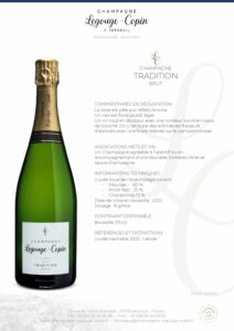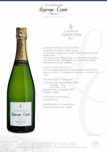 Notre Champagne TRADITION Brut est un Blanc de Noirs, il offre un ensemble harmonieux et typique d'un champagne de vigneron issu de la Vallée de la Marne.